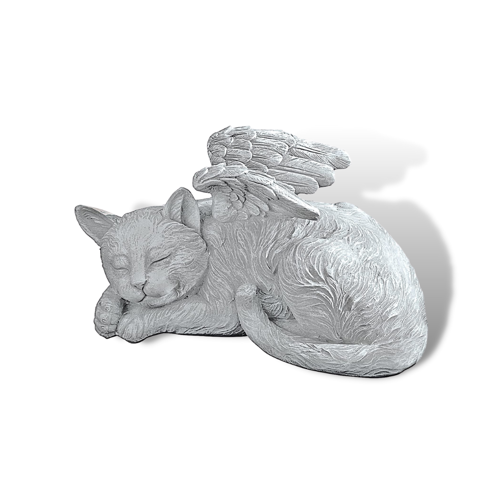 • Features a peacefully sleeping cat with feathered angel wings, depicted in comforting hands, symbolizing eternal peace