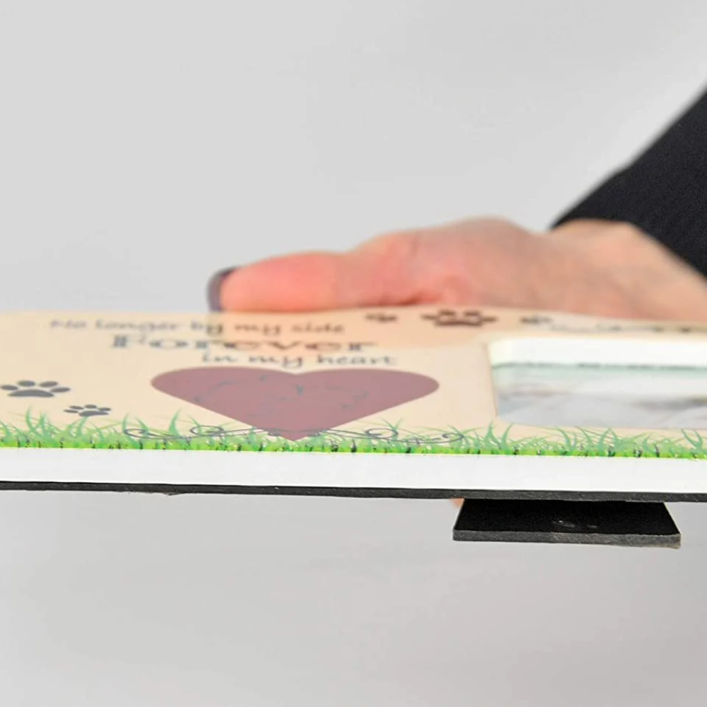 - Features heartfelt paw prints, hearts, and the inscription "No longer by my side. Forever in my heart"